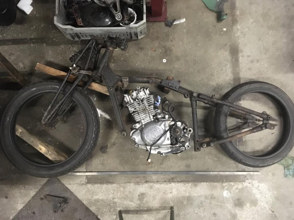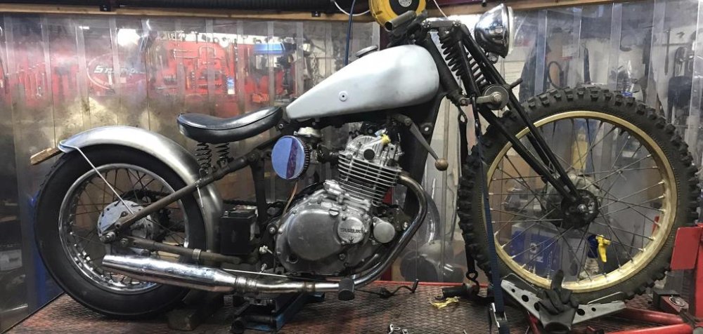 Een Dollar- frame uit 1937. en wat Suzuki onderdelen. De opdracht: maak er een rijdende chopper van. En dat is gelukt met veel passen en meten.