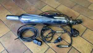 Dit is een universele Afr (air Fuel Ratio) meter. Dan kan je live en dynamisch je mengsel samenstelling zien tijdens het rijden. En zo conclusies trekken over bijv. hoe de sproeierverhouding is. Deze is pas gemaakt met een bonneville uitlaat zodat ik makkelijk kan wisselen voor montage en testen.